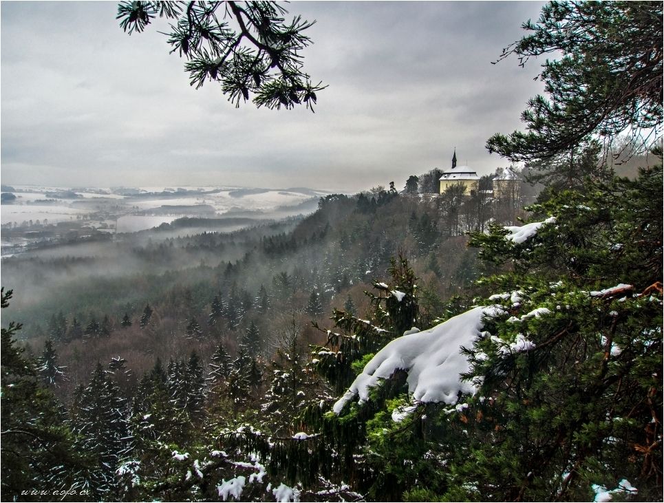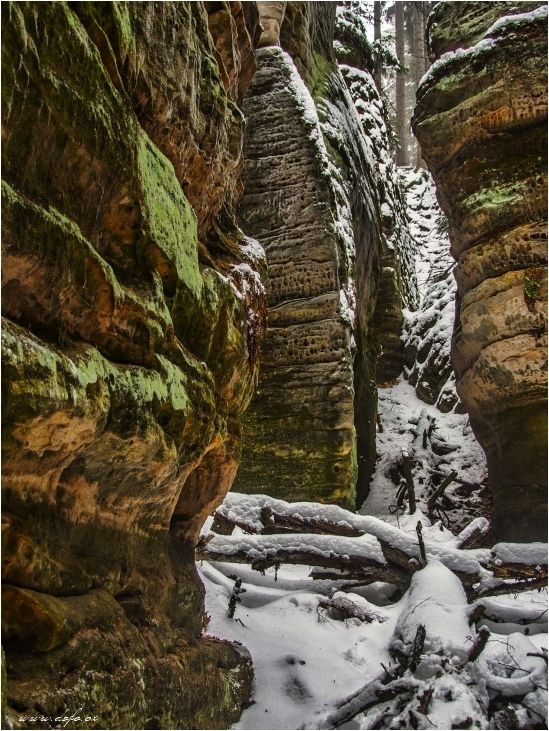 Atmosféra kolem nás byla opravdu nádherně zimní. Temné skalní obrysy pocukrované bílým sněhem. Větve stromů ohýbající se pod jeho vahou. A naše kroky které narušovaly tu čistou neporušenou pokrývku.